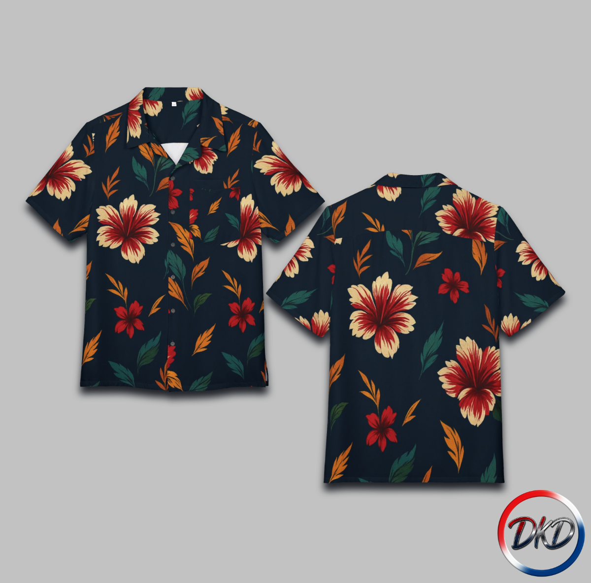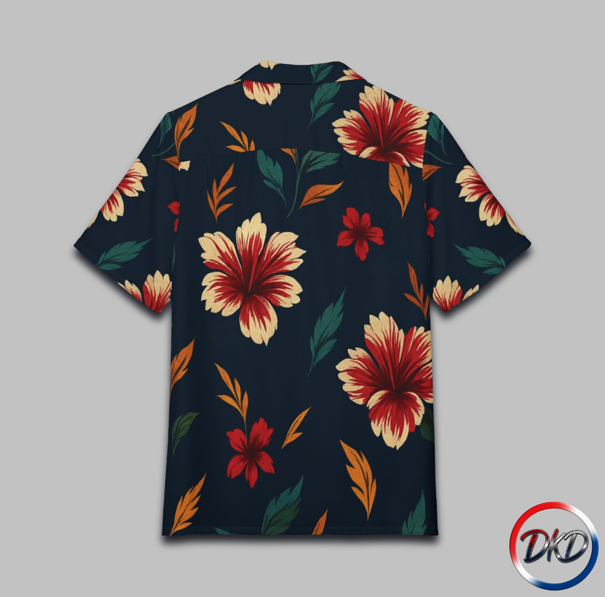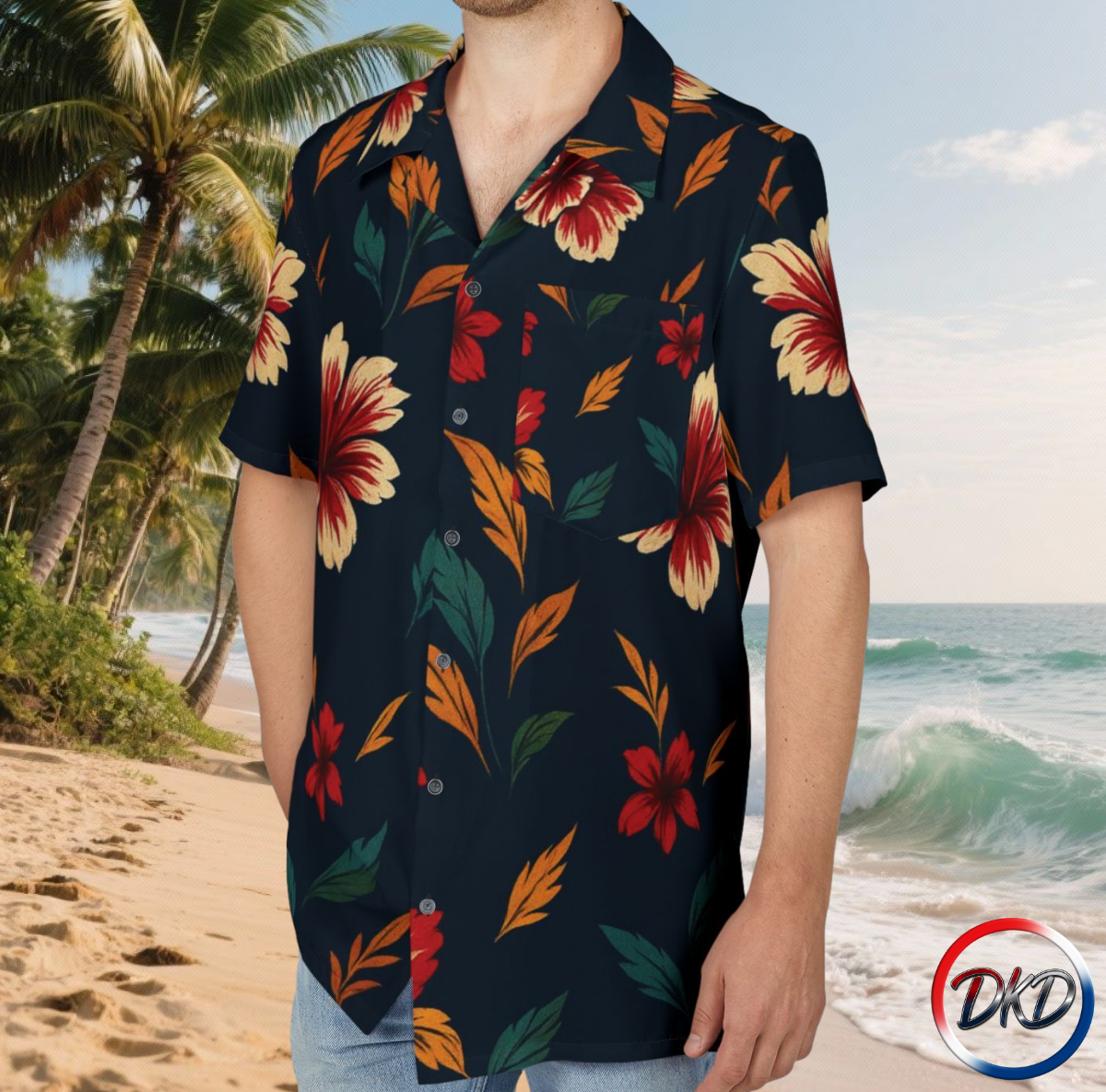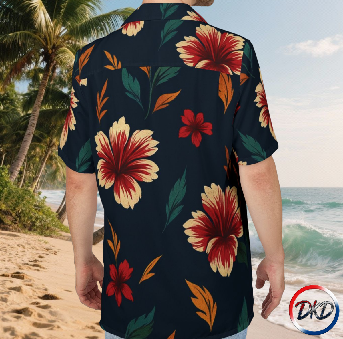 Bright, breezy, and full of island charm — Harbor Bloom Haven brings a vibrant tropical energy to a unisex Hawaiian shirt designed for effortless warm‑weather style. The deep navy base sets a rich, coastal tone, while cream, red, and orange hibiscus‑style florals bloom across the fabric with lush green leaves for balance. Lightweight, breathable, and relaxed in fit, this shirt is perfect for vacations, beach days, summer gatherings, or adding a bold tropical twist to your everyday wardrobe.