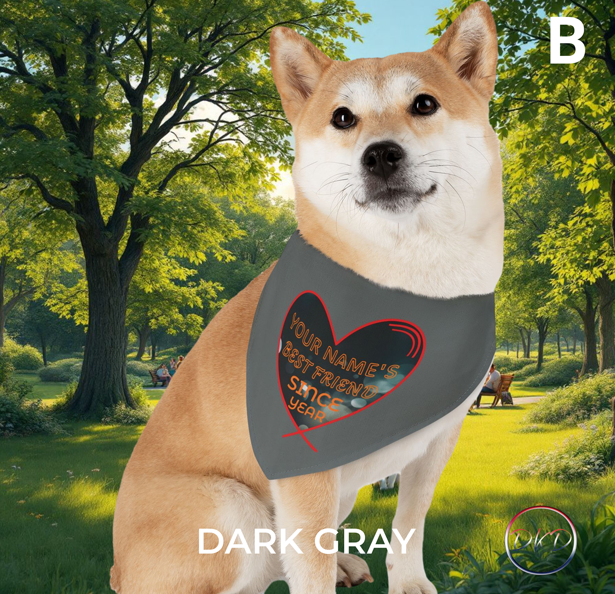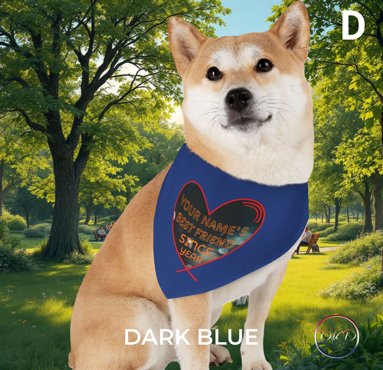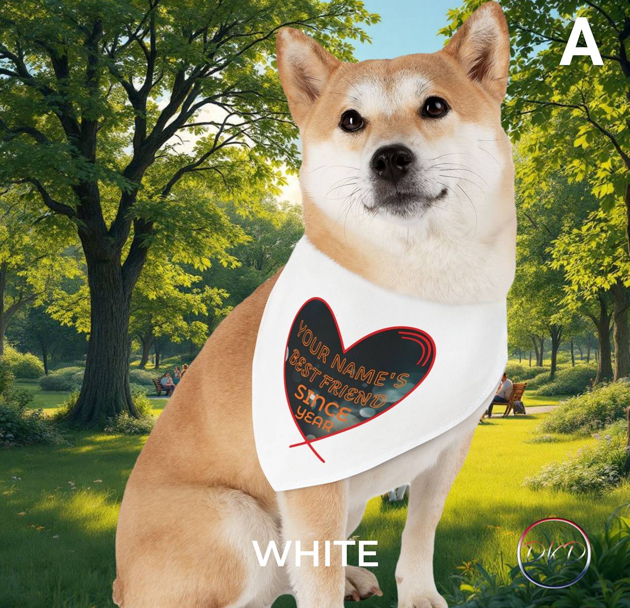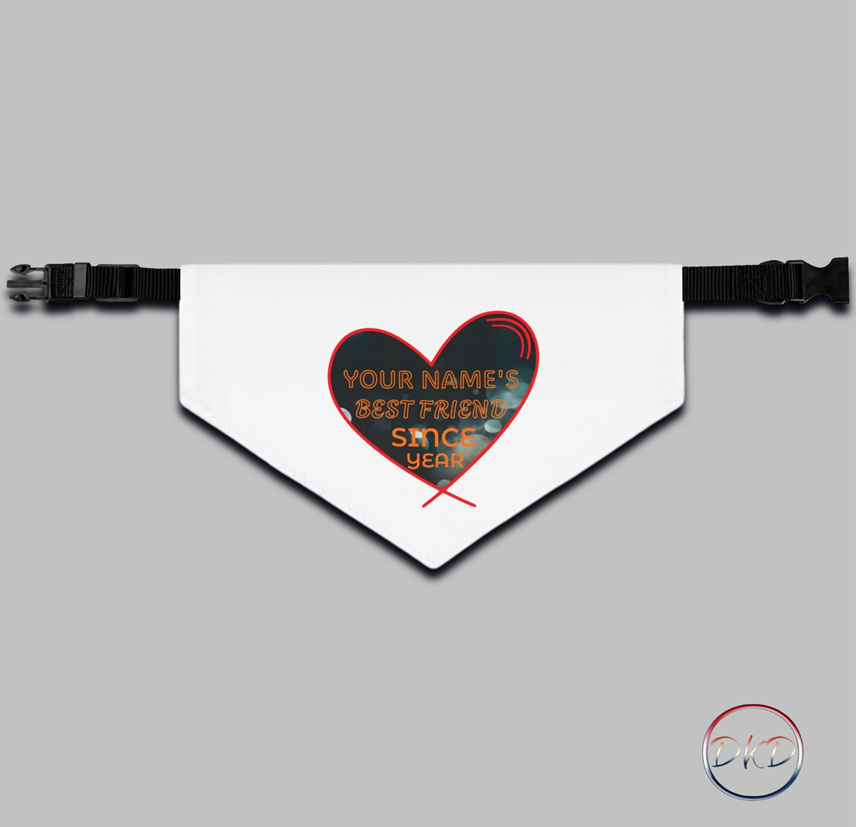 A personalized pet bandana with your name (as best friend) and acquired date, set against a Bokeh background and wrapped in a vintage doodle-style heart. This pet bandana exudes a loving and playful vibe, making your furry friend feel special. Perfect for pet owners looking to pamper their beloved companions, this bandana is ideal for pet birthdays, adoption anniversaries, and everyday wear.