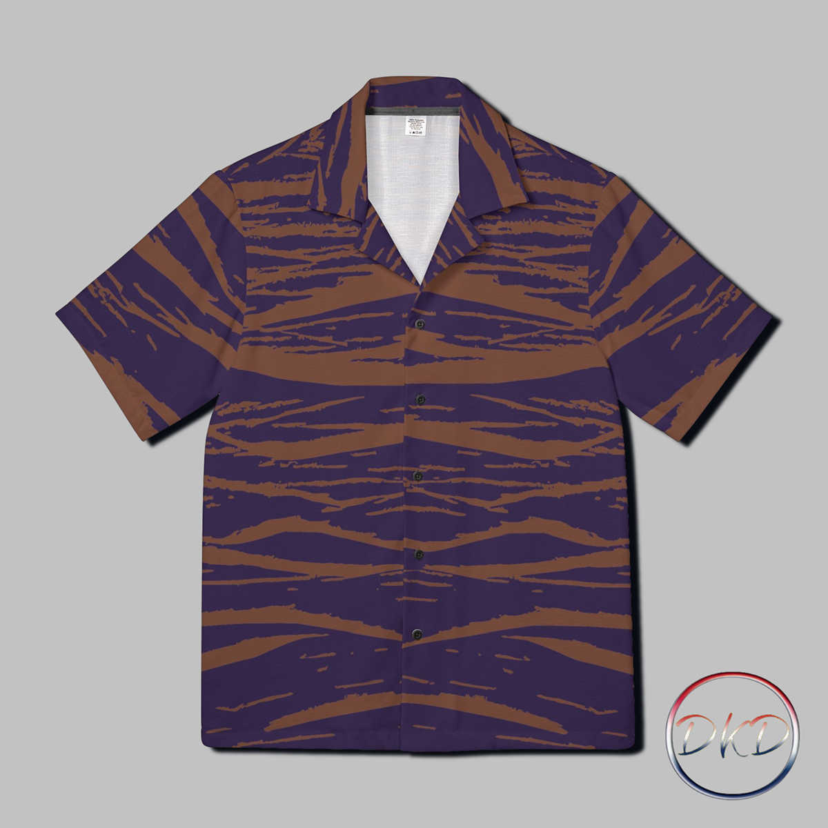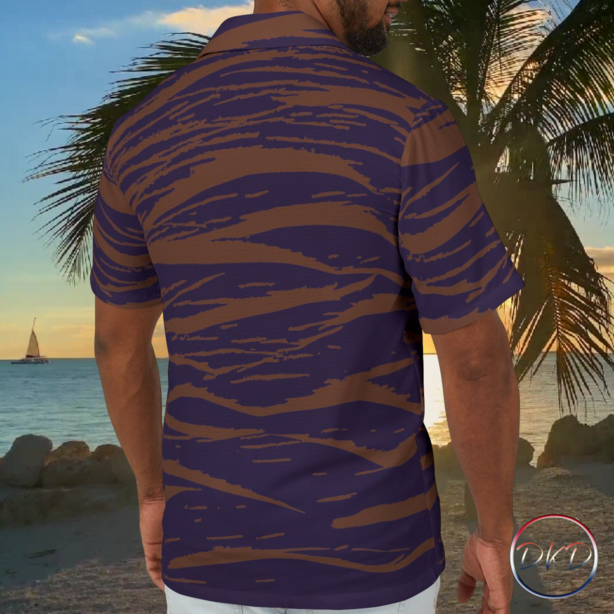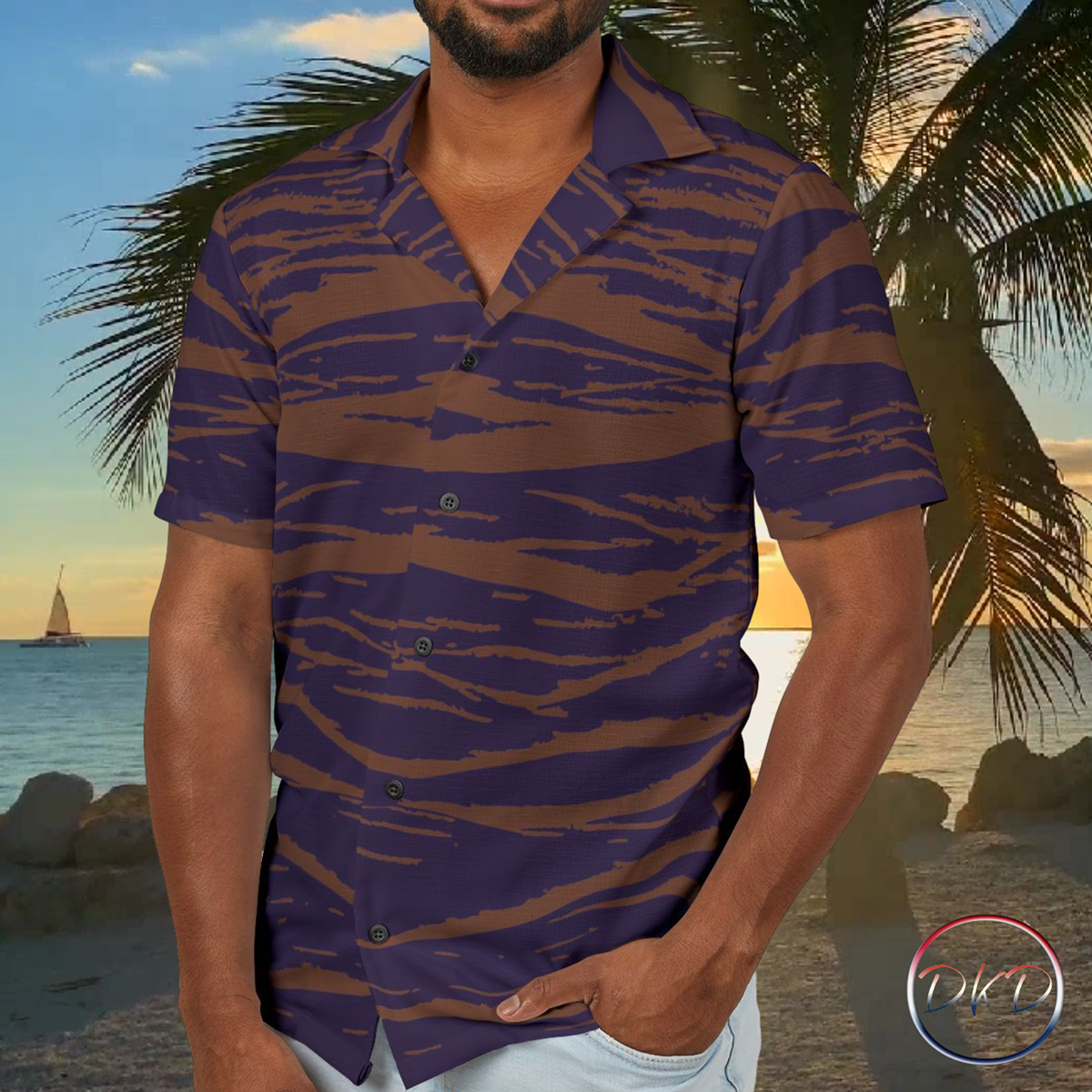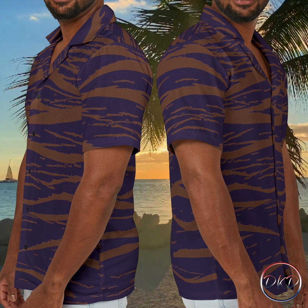 The “Hawaiian Twilight” Hawaiian shirt captures the magical hues of a Hawaiian sunset with deep purple and rich reddish brown. The abstract pattern reflects the dynamic colors of the sky and landscape, evoking the serene beauty of Hawaii’s evening skies. Perfect for those who love tropical vibes and want to bring a piece of paradise into their wardrobe. Ideal for summer vacations, beach outings, luau parties, and Hawaiian-themed events.